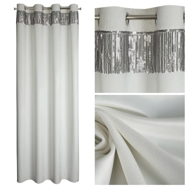 Curtain from Jasper collection these decorations in modern style, made of soft and delicate velvet. The upper part is decorated with a band of shiny sequins, which accentuates the uniform pattern of the product. The whole creates a phenomenal effect in a room, decorated in a fashionable and original style. The curtain will look beautiful in the living room or bedroom, emphasizing the appearance of the room. It fulfills not only visual, but also practical functions. The curtain effectively insulates the sun's rays, creating a pleasant atmosphere in the room and providing privacy. Hanging on 8 grommets , the application of the product on the curtain rod takes only a short moment. It is a suggestion especially for those who have a taste for chic glamour style.