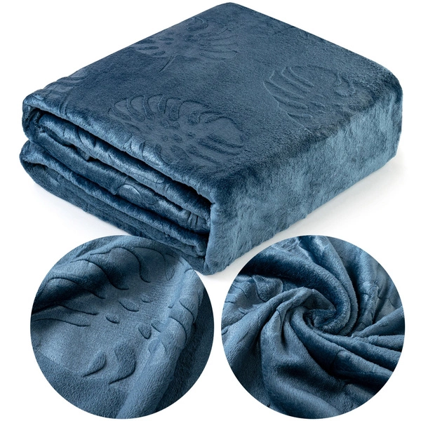 The product in a navy blue shade shows a fashionable tropical embossing depicting monstera leaves. The modern design makes the blanket a unique decoration that will refresh the look of any room. Thanks to the pleasant-to-the-touch fabric from which it is made, it will prove ideal as a pleasant covering on cold days and mornings. It can also be used as a bedspread on the sofa or bed.