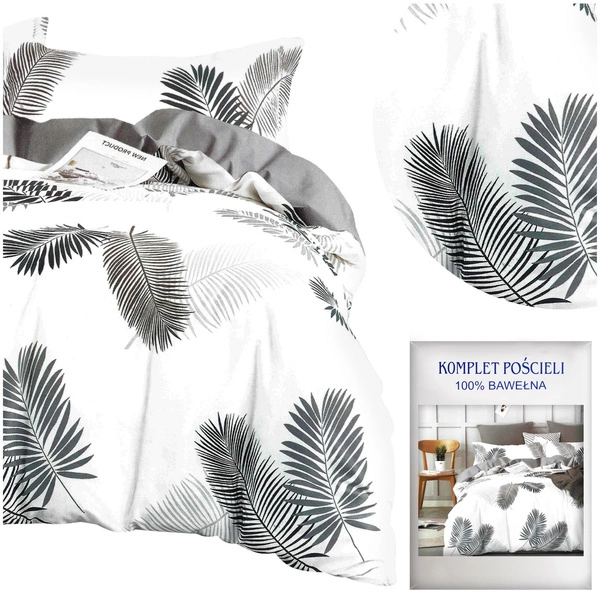 Cotton satin bedding is a high-quality fabric with a satin weave of cotton fibers, providing exceptional softness. This type of fabric is distinguished by a delicate sheen and is velvety to the touch. The high structure of the fibers allows air to circulate freely, so that, in winter it gives us warmth and in summer it cools. The natural composition ensures that our skin will be able to breathe freely under it. An additional advantage of the bedding is its ease of use as it is not slippery, it adheres very well to the quilt. The zipper makes it quick and convenient to change, even though it is discreetly placed. The bedding depicts gray palm leaves on a white background.