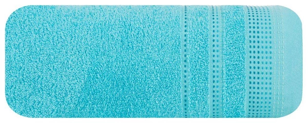 Single-colored towel made of soft and absorbent cotton fabric with terry weave decorated with colorful bordure in the style of fastidiousness.