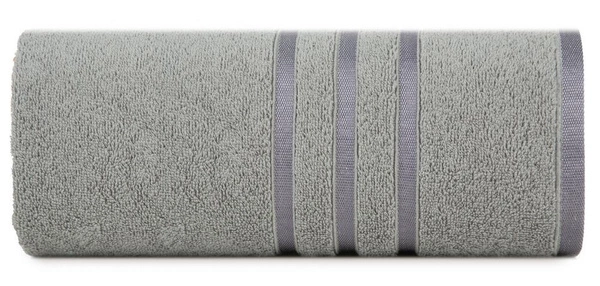 - The Madi collection presents an elegant steel-colored towel with a shiny border.