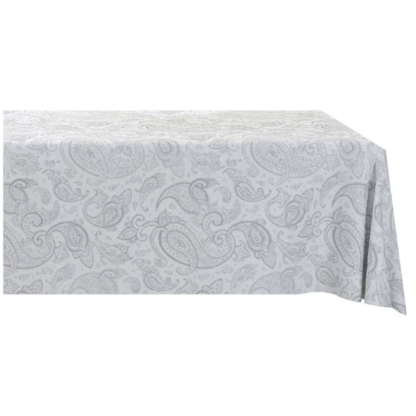 - Tablecloth from the Panama collection showing an ornamental pattern on a gray background.
