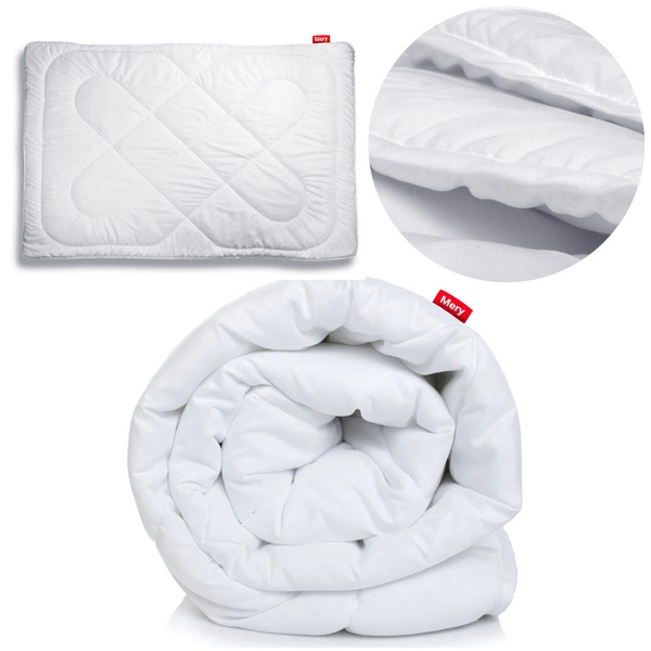 The duvet covered with a microfiber fabric 200g/m2 is a highly breathable material. It is not slippery but pleasant to the touch. Filled with silicone fiber, it retains its fluffiness for a long time. Light and airy, it has antiallergic properties, making it perfect for those who cannot tolerate natural down. It ensures warmth and air circulation. It is finished with piping and packed in a suitcase, making it suitable for a gift. Ideal for spring.