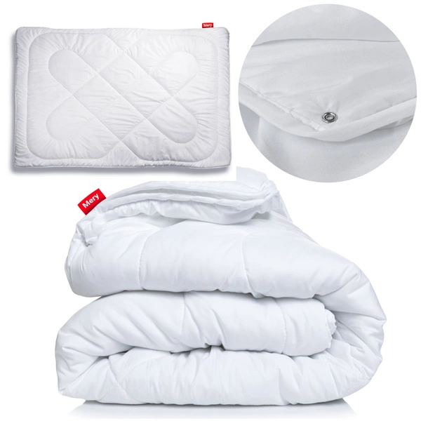 The duvet is covered with a microfiber fabric of 100g/m2 + 400g/m2, which is a highly breathable material. It is not slippery, but pleasant to the touch. Filled with silicone fiber, it retains its fluffiness for a long time. Light and airy, it has anti-allergic properties, making it perfect for those who cannot tolerate natural down. It ensures warmth and air circulation. An additional advantage is the ability to detach one part of the duvet, creating a light, spring cover. It is finished with piping and packed in a suitcase, making it suitable as a gift. Ideal for any season.