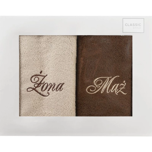 The set includes two towels in different colors. One bears the inscription "Husband" and the other "Wife". Packaged in an aesthetically pleasing cardboard box, it will be a great gift for a married couple who is decorating a new apartment in a modern style.
