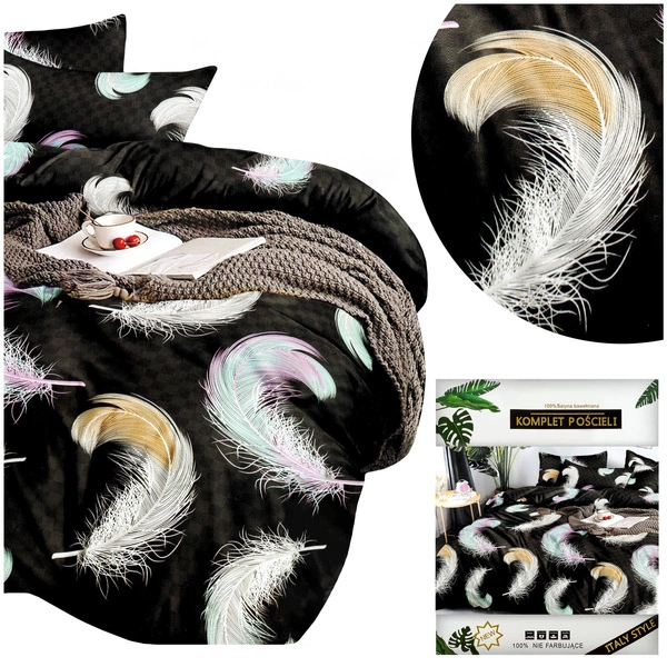 Excellent color rendering and modern designs are characteristic features of Dalwin bedding. Lovers of unconventional motifs will appreciate their creativity, and fans of stylish colors will be entranced. The set, thanks to its simplicity and elegance, will meet the expectations of every customer. The bedding depicts bright feathers on a black background.