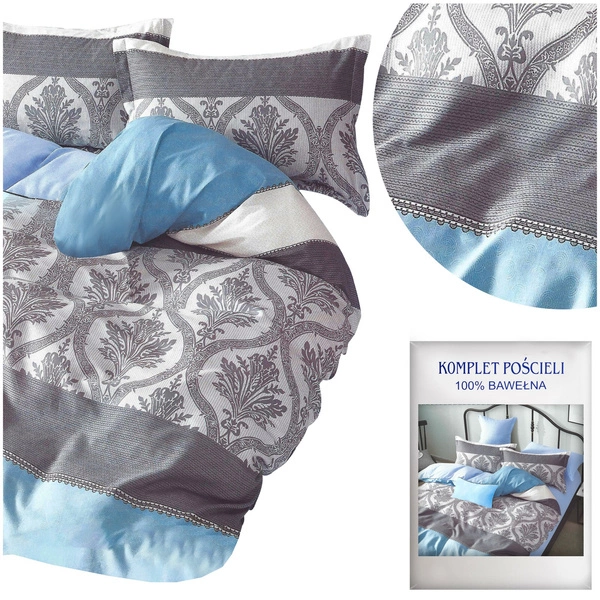 Bedding made of cotton satin is a high-quality material with a satin weave from cotton fibers, providing exceptional softness. This type of fabric is characterized by a delicate sheen and is velvety to the touch. The high structure of the fibers allows for free air circulation, ensuring warmth in winter and coolness in summer. The natural composition ensures that our skin can breathe freely beneath it. An additional advantage of the bedding is its ease of use, as it is not slippery and adheres very well to the duvet. The set features an ornamental pattern on a gray background. The reverse side is solid.