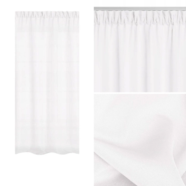 It has a standard size of 140x175 cm and fastening in the form of a tape, which can be put on the curtain rods with the help of jabs, hooks or even a tunnel.