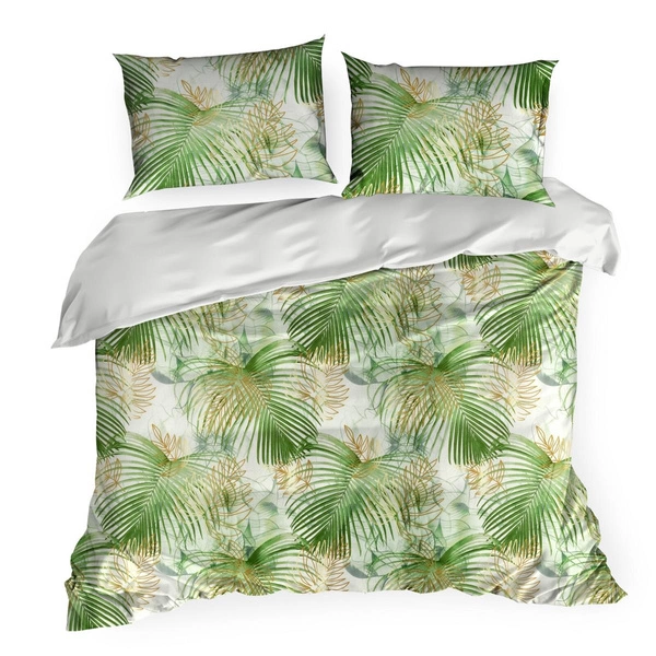 The Nelly bedding set is made of high quality cotton satin. The fabric is characterized by dense satin weave and sheen, thanks to which the bedding is pleasant to the touch, durable and warm. Additionally does not irritate the skin and does not affect excessive perspiration of the body, which ensures comfortable rest. Modern printing technique guarantees color durability and the pattern does not lose its intensity even after many washings. On the bedding in white and green color there is a print depicting palm leaves, while the underside is solid.