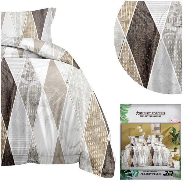Maria bedding is made of cotton satin, so it is pleasant and soft to the touch. It is very durable, and easy to care for. It has hygienic properties and keeps you warm. It is fastened with a zipper, which makes changing the bedding easy, fast and efficient. The print that is on the material was applied with 3D technology. Excellent color rendering and modern designs are the hallmarks of this collection. The set features a marbled and geometric pattern in shades of cream, gray and brown.
