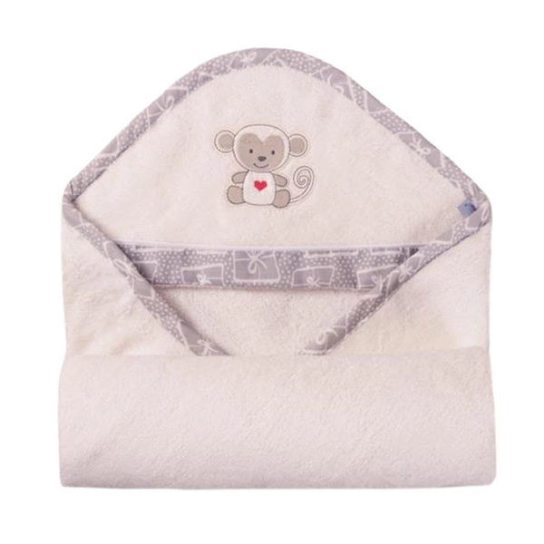 The towel is aesthetically pleasing and delights due to decorative piping, as well as a decorative application presenting a small monkey.