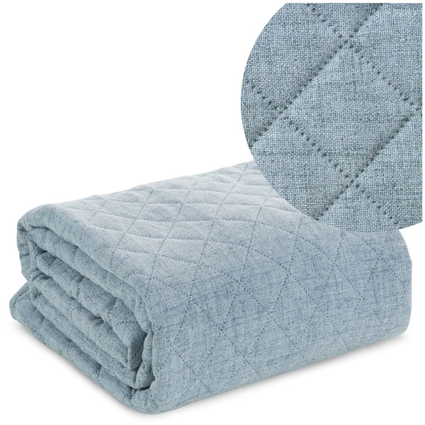 Linen bedspread is made of fabric with a texture reminiscent of structure linen. The uniform pattern in blue color is decorated with quilting in a geometric pattern.