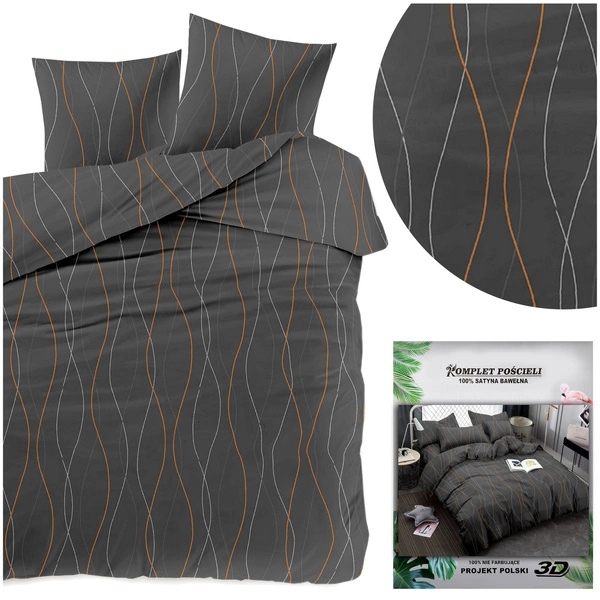 The print that is on the material was applied with 3D technology. Excellent color rendering and modern designs are the hallmarks of this collection. The presented set in a dark shade of gray shows wavy colorful lines.