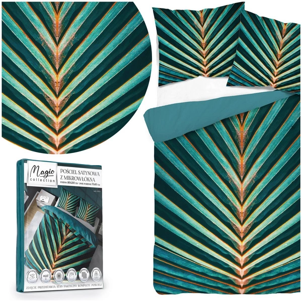 It comes in a variety of patterns and colors, which will allow you to choose the perfect set to match your bedroom arrangement. The presented model on the top side shows a print in shades of green, while the bottom is solid.