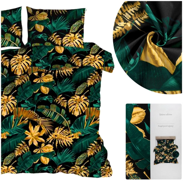 The material is durable and durable, making the bedding more resistant to stretching, and the colors retain their intensity even after repeated washing. Easy to clean and sewn zippers make it very practical. The fashionable design depicting gold and green leaves on a black background makes the bedding look very tasteful and will decorate the interior of your bedroom.