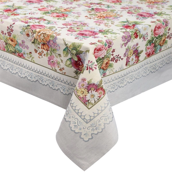 It is made of thick fabric, decorated with embroidered, colorful flowers and leaves. In addition, the piping features a lace motif. Any room using this tablecloth will acquire a unique atmosphere.