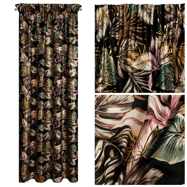 - ^^ Exotic flowers - will give the interior a unique character ^^ Velvet fabric - is a chic material that will shield the incoming sunlight ^^ Tape with tunnel function - a versatile and practical way to fix the curtain