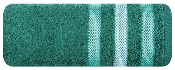 Cotton towel is an absolute "must have" in any bathroom. The material is soft and pleasant to the touch and easily and quickly absorbs water. It does not cause irritation, so it can easily be used by both children and adults. The uniform green color decorated with a striped border will emphasize the style of the bathroom and fill it with harmony and elegance. It is also a great and practical gift idea.