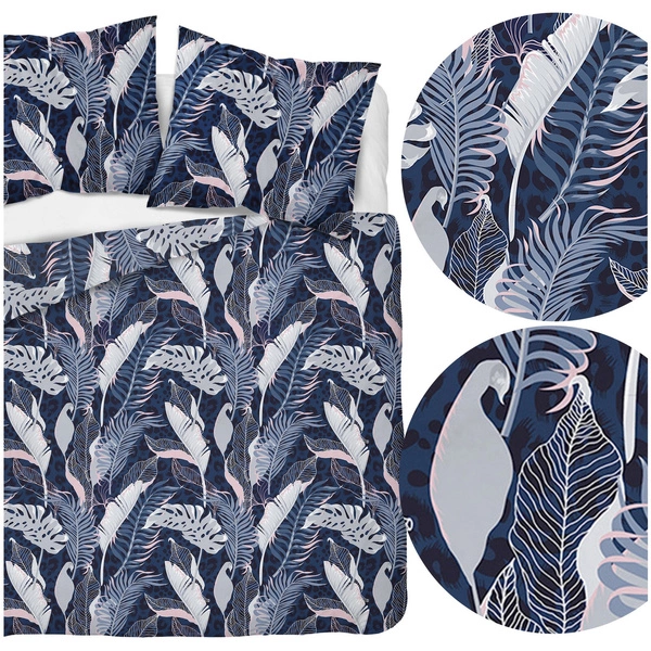 ASTI Bedding set is a positive surprise with the new collection. The bedding is in the shade of blue and depicts leaves. Interesting patterns, rich muted colors and very good quality fabric will make the bedding delight us. The composition of the fabric is 100% cotton, so the bedding is durable and pleasant to the touch, in addition, it does not irritate the skin. Even after many washings the set does not lose its colors and does not change size. The product has a practical zipper, which will make it easier and shorter to change the bedding. Before the first use, the set should be washed, turned inside out to preserve the colors, life and avoid abrasions from the drum.