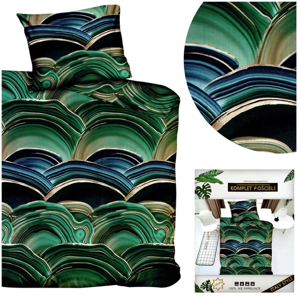 Excellent color rendering and modern designs are characteristic features of Dalwin bedding. Lovers of unconventional motifs will appreciate their creativity, and fans of stylish colors will be entranced. The set, thanks to its simplicity and elegance, will meet the expectations of every customer. The presented model shows a marbled pattern in a green-golden shade.