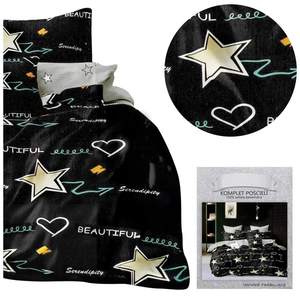 Melita bedding is made of cotton satin, and thanks to a special weave it has a light sheen. It is soft and pleasant to the touch and has exceptionally vivid and saturated colors that will delight the most demanding customer. The bedding is distinguished by its fashionable and elegant design, so it is sure to match any interior. The set depicts stars, lettering and hearts, while the bottom is in gray with stars.