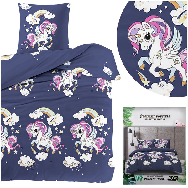 The print that is on the material was applied with 3D technology. Excellent color rendering and modern designs are the hallmarks of this collection. On the set there is a print depicting unicorns on a blue background.