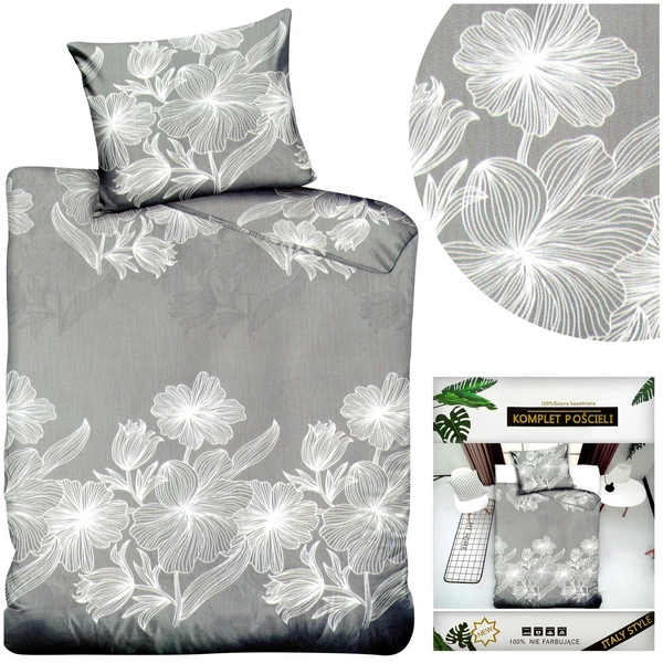 Excellent color rendering and modern designs are characteristic features of Dalwin bedding. Lovers of unconventional motifs will appreciate their creativity, and fans of stylish colors will be entranced. The set, thanks to its simplicity and elegance, will meet the expectations of every customer. The presented model shows flowers on a gray background.