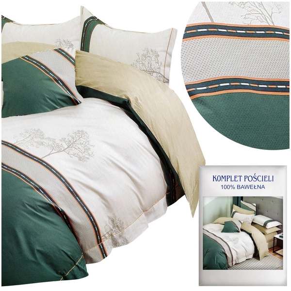 Cotton satin bedding is a high-quality fabric with a satin weave ofcotton fibers, providing exceptional softness. This type of fabric is distinguished by a delicate sheen and is velvety to the touch. The high structure of the fibers allows free air circulation, so that, in the winter it gives us warmth and in the summer it cools. The natural composition of ensures that our skin will be able to breathe freely under it. An additional advantage of the bedding is its ease of use as it is not slippery, it adheres very well to the quilt. The set depicts trees and a geometric motif on a background in white and green .