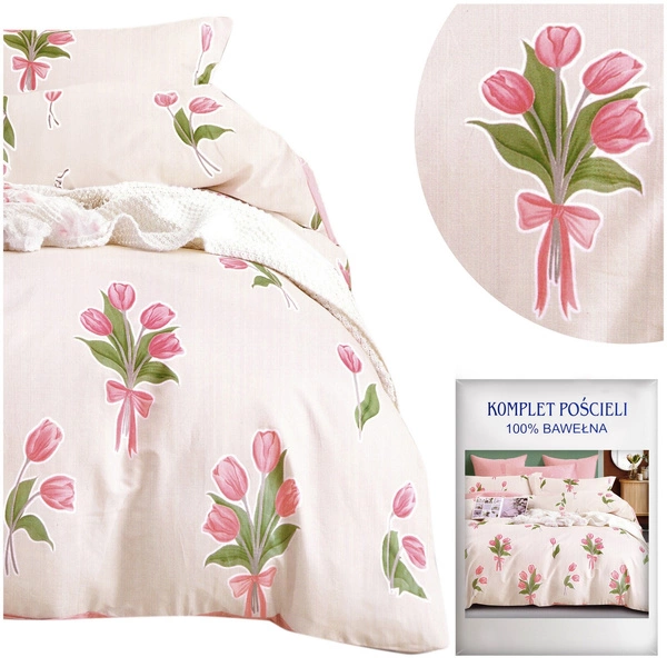 Cotton satin bedding is a high-quality fabric with a satin weave ofcotton fibers, providing exceptional softness. This type of fabric is distinguished by a delicate sheen and is velvety to the touch. The high structure of the fibers allows free air circulation, so that, in the winter it gives us warmth and in the summer it cools. The natural composition of ensures that our skin will be able to breathe freely under it. An additional advantage of the bedding is its ease of use as it is not slippery, it adheres very well to the quilt. The set depicts pink tulips on a cream background.