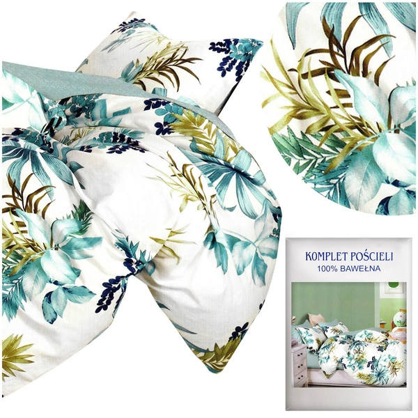 Cotton satin bedding is a high-quality fabric with a satin weave ofcotton fibers, providing exceptional softness. This type of fabric is distinguished by a delicate sheen and is velvety to the touch. The high structure of the fibers allows free air circulation, so that, in the winter it gives us warmth and in the summer it cools. The natural composition of ensures that our skin will be able to breathe freely under it. An additional advantage of the bedding is its ease of use because it is not slippery, it adheres very well to the quilt. The set in shades of white and green depicts tropical flora.