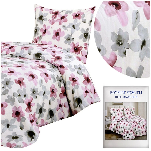 Cotton satin bedding is a high-quality fabric with a satin weave ofcotton fibers, providing exceptional softness. This type of fabric is distinguished by a delicate sheen and is velvety to the touch. The high structure of the fibers allows free air circulation, so that, in the winter it gives us warmth and in the summer it cools. The natural composition of ensures that our skin will be able to breathe freely under it. An additional advantage of the bedding is its ease of use as it is not slippery, it adheres very well to the quilt. The set in the shade of white shows pink and gray flowers.