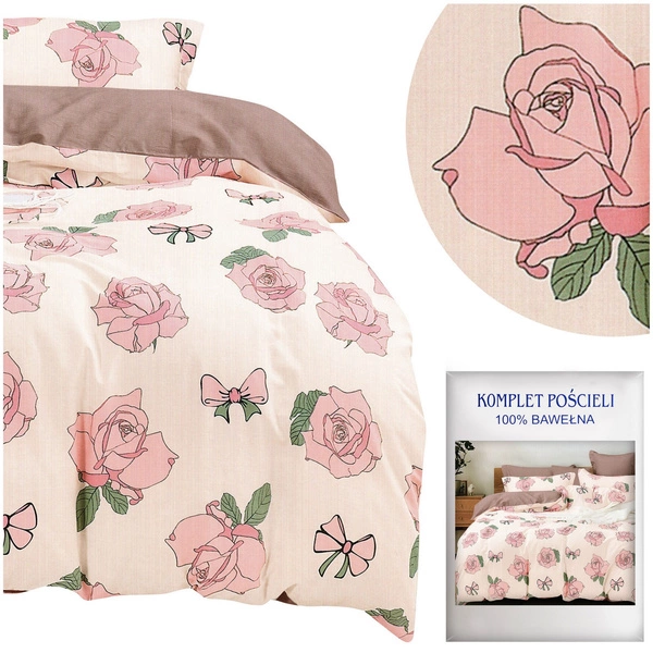 Cotton satin bedding is a high-quality fabric with a satin weave ofcotton fibers, providing exceptional softness. This type of fabric is distinguished by a delicate sheen and is velvety to the touch. The high structure of the fibers allows free air circulation, so that, in the winter it gives us warmth and in the summer it cools. The natural composition of ensures that our skin will be able to breathe freely under it. An additional advantage of the bedding is its ease of use as it is not slippery, it adheres very well to the quilt. The set in a shade of pink shows roses and bows.