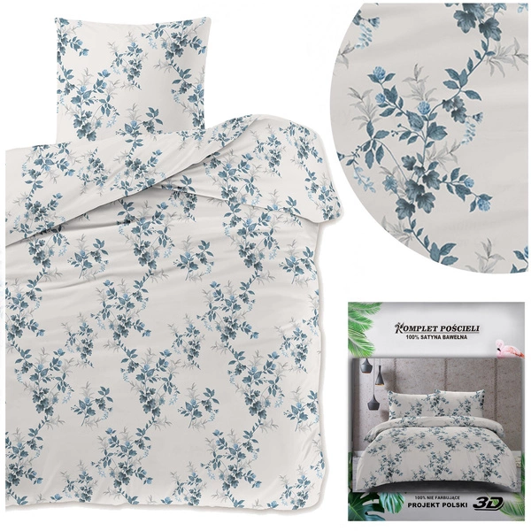 The print that is on the material was applied with 3D technology. Excellent color rendering and modern designs are the hallmarks of this collection. On the set there is a print depicting small blue flowers on a cream background.