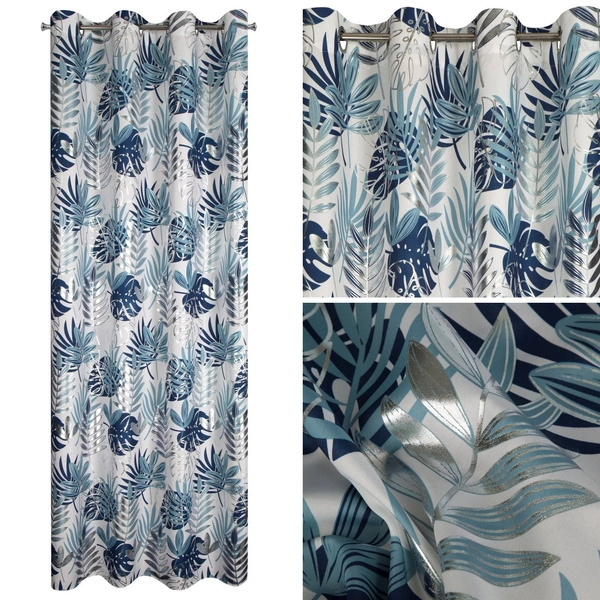 The motif of leaves, clearly outlined on white background, brings a touch of nature into the interior, creating a relaxing and peaceful atmosphere. The leaf pattern is in shades of blue, which adds a sophisticated touch to the curtain.