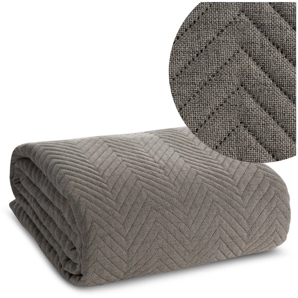 Linen bedspread is made of fabric with a texture reminiscent of structure linen. The uniform pattern in steel color is decorated with herringbone quilting.