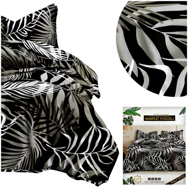Excellent color reproduction and modern patterns are characteristic features of the Dalwin bedding. Lovers of unique motifs will appreciate their creativity, while fans of stylish colors will be delighted. The set, with its simplicity and elegance, will meet the expectations of every customer. The presented model features leaves on a black background.
