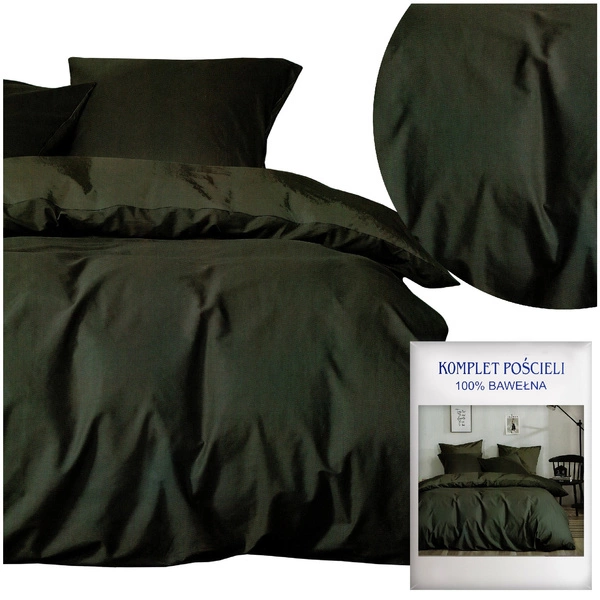 Bedding made of cotton satin is a high-quality material with a satin weave made from cotton fibers, providing exceptional softness. This type of fabric is characterized by a delicate sheen and is velvety to the touch. The high structure of the fibers allows for free air circulation, keeping us warm in winter and cool in summer. The natural composition ensures that our skin can breathe freely underneath it. An additional advantage of the bedding is its ease of use as it is not slippery and adheres very well to the duvet. The set in a dark green shade is solid.