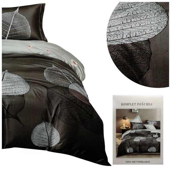 The bedding is made using the latest 3D technology from high-quality microfiber, making it thick and soft to the touch, which ensures it pleasantly wraps around the body and warms you during cool nights. The product features exceptionally vibrant and saturated colors that will delight even the most demanding customer. It stands out with a fashionable and elegant design that catches the eye and enriches the bedroom interior. The displayed set features large leaves on a dark gray background.