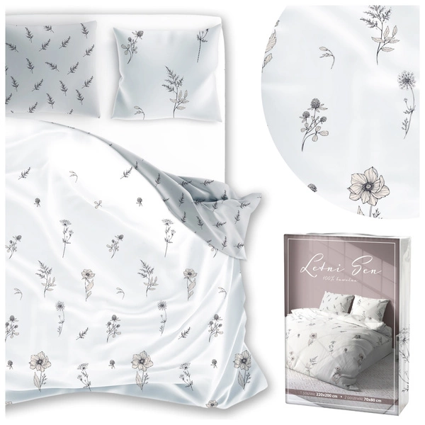 Double-sided bedding, Bedding composition: 100% Cotton, 2 pillowcases 70x80 Size tolerance: +/- 3% Can be washed at 40° The comforter cover and pillowcases are zippered