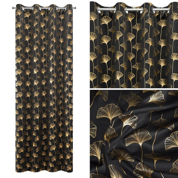 - Blackout curtain with a modern style with a pattern of gold fans on a background of black color. Elegant decoration hung with even grommets.