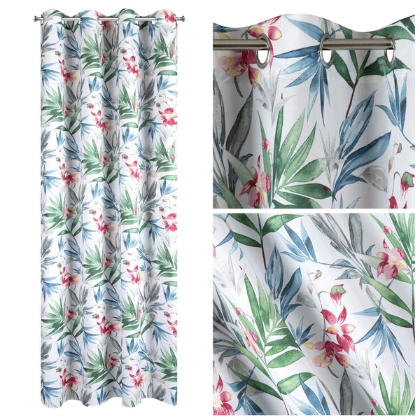 - Alia curtain made of velvet fabric with a print of green leaves and red flowers on a white background. It is hung with grommets.
