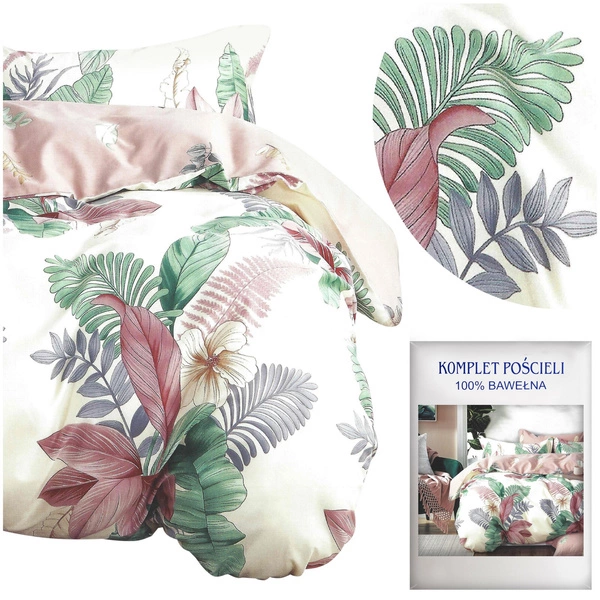 Cotton satin bedding is a high quality cotton fiber satin weave fabric, providing exceptional softness. This type of fabric is distinguished by a delicate sheen and is velvety to the touch. The high structure of the fibers allows air to circulate freely, so that, in winter it gives us warmth and in summer it cools. The natural composition ensures that our skin will be able to breathe freely under it. An additional advantage of the bedding is its ease of use as it is not slippery, it adheres very well to the quilt. The zipper makes it quick and convenient to change, even though it is discreetly placed. The product does not lose color when washed repeatedly. You should turn the printed bedding inside out before washing to preserve its luscious colors, longevity and avoid abrasions from the drum. Also remember, close the zippers in the pillowcase and pillowcases to prevent entanglement of the elements of the set during washing, which often causes inaccurate rinsing of washing substances. The bedding is cream in color with black, green and navy blue leaves on the surface of the set.