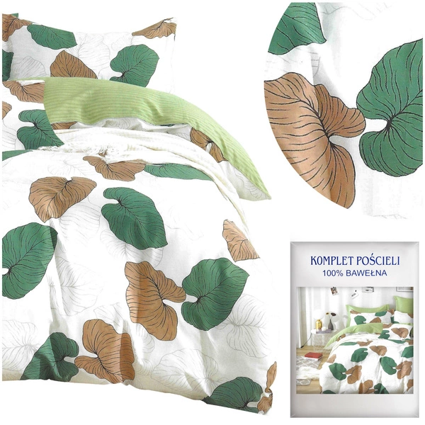 Cotton satin bedding is a high-quality cotton fiber satin weave fabric that provides exceptional softness. This type of fabric is distinguished by a delicate sheen and is velvety to the touch. The high structure of the fibers allows air to circulate freely, so that, in winter it gives us warmth and in summer it cools. The natural composition ensures that our skin will be able to breathe freely under it. An additional advantage of the bedding is its ease of use as it is not slippery, it adheres very well to the quilt. The zipper makes it quick and convenient to change, even though it is discreetly placed. The product does not lose color when washed repeatedly. Be sure to turn the printed bedding inside out before washing to preserve its luscious colors, longevity and avoid abrasions from the drum. Also remember, close the zippers in the duvet cover and pillowcases to avoid tangling of the set's elements during washing, which often results in inaccurate rinsing of laundry substances. The set shows brown and green drawn leaves, which are densely distributed throughout the set.
