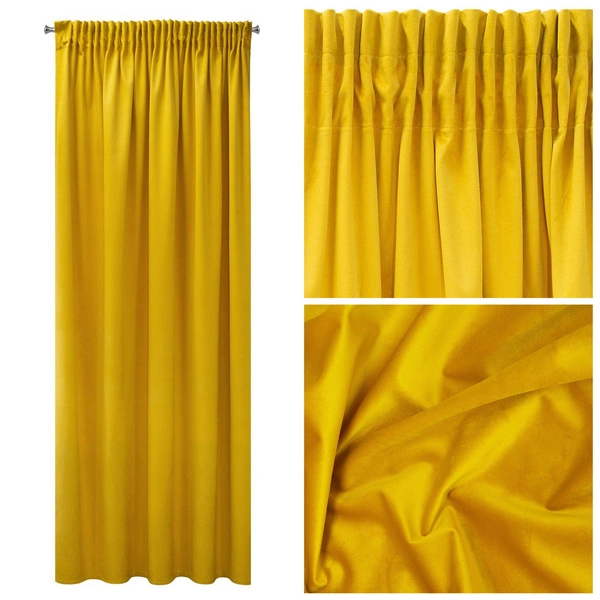 Soft to the touch, lounge velour curtain in mustard shade with a subtle sheen. Great attention to it is attracted by the careful and aesthetic finish. Original and refined window decoration for modern as well as classic interiors. They will perfectly blend into bedroom or living room windows.