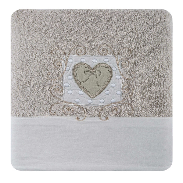 The terry towel is made of soft and delicate cotton fabric. It is characterized by high absorbency. An additional advantage are antibacterial properties. It is ideal for saunas and baths, but also as a product for everyday use. It is not allergenic and does not irritate the skin, so it can be used by children. Smooth borders with an embroidered heart will blend in with any style of bathroom.