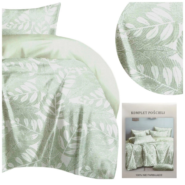 The bedding is produced with the latest 3D technology with high quality microfiber, which makes it pleasant and soft to the touch. The product has extremely vivid and saturated colors that will delight the most demanding customer. The bedding is distinguished by a fashionable and elegant design. It is zippered with a zipper. The set depicts leaves in shades of green on a white background.