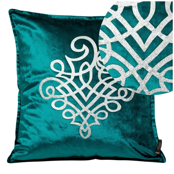 Velvet pillowcase will be the perfect finishing touch to the interior design in glamour style. It will introduce an original and chic decor to the room and attract the attention of household members and guests. Turquoise color, decorated with an ornamental application will enhance the appearance of the living room. The fabric is very nice to the touch and has a delicate sheen, which adds to its charm.